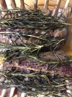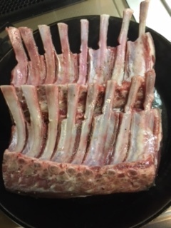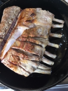 オーブンからパイレックスを取り出し、焦げ目のついたラム・フレンチラックとローズマリーを載せてオーブンに戻します。