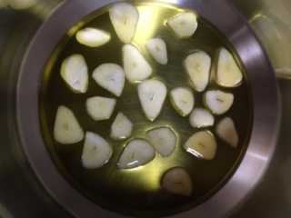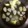 まず、大蒜をスライスして、超弱火でじっくりオリーブオイルで熱します。今回使ったオリーブオイルは、イタリアのLorenzo #1です。