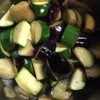 塩を軽く振っておいた 茄子、ズッキーニにオイルが馴染んで少し焦げができるまで弱火でゆっくり炒めます。