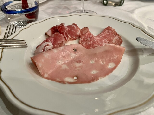 特にパンチェッタとサラミは今まで食べた中で一番と言って良いでしょう。熟成の香りが強く、口に含んだ時の脂の溶け具合と旨味が絶妙でハウスワイン(赤)が物足らないくらいでした。コペルトに載せて食べていると『もうこれだけで幸せだ。』という顔をしたようです。007のフィリックス・ライター似のテーブル担当給仕が、通りすがりにニヤッと笑って行きました。これは互いの意思疎通であり、独りの食事が楽しくなります。グラスが空くと「これは、私の気持ちです。」と言って二回も注ぎ足してくれました。(請求には一杯分しか載っていません)