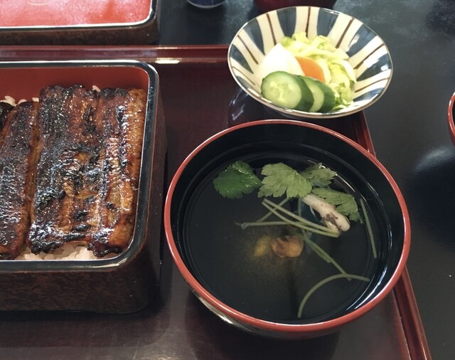 割き〜串打ち〜白焼〜蒸し〜たれ浸し〜本焼き の行程を経る間(ま) を楽しむ鰻の蒲焼は重箱の蓋を取ると同時に立ち上る鼻腔を擽る香りによっって箸が止まらなくなるものですが、まずは眼福を楽しみゆっくり右下の蒲焼から食べ始めることが大事です。決して箸で重箱の底をコツコツと突付く音を立ててはいけません。この時、ご飯と一緒に頬張ると『溢してはいけない』と指先に緊張感が生まれるので香りを楽しみながら蒲焼とご飯は別々に食べたほうがおいしさをより深く得ることができます。理性のある人間は腹を空かした獣じゃないので「もう少しゆっくり味わって食べたほうがいいですよ。」と言いたくなります。