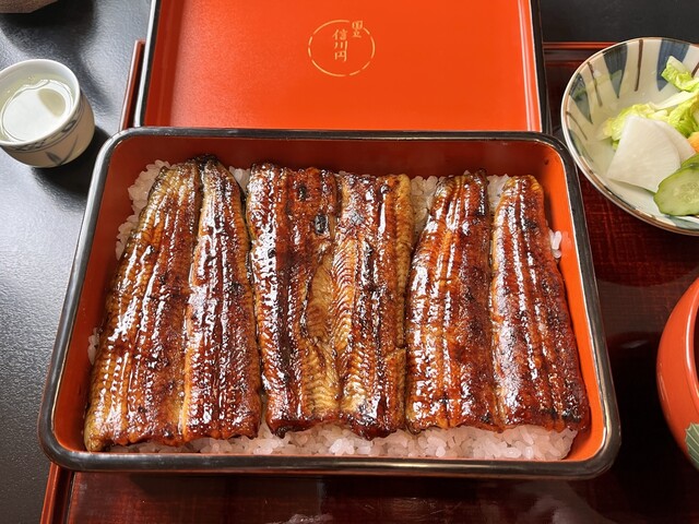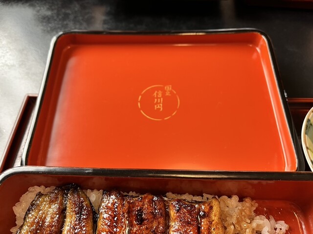 鰻屋 "おひとりさま" の場合、先付け程度のつまみで盃を重ねながら30分程度 文庫本を開き、鰻の蒲焼が仕上がるのを待つというのが一般的な景色であり、スマートフォンを開くのは野暮の極みです。ここ「信川円」では南に面した窓下に小さな本棚が据えられ品格のある雑誌類が置かれています。パラパラと捲り、そこに描かれた世界に浸りながら待っていると「おまちどうさま。」と女将さんの優しい声と共に 鰻重 (は) 一串半 が運ばれてきます。まずは全容を眺め、ゆっくり重箱の蓋を取ると寒い季節のため餌喰いが少なくなった分、洗練された鰻の香りが立ち上り鼻腔を擽ります。決して忙しなく食べてはいけません。逸る気を抑えながらじっくりと味わい最後までゆっくり箸を運ぶと食べ終えた時の満足感が一入です。