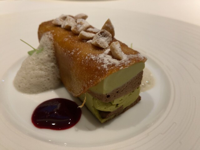 クレープ生地の下には、2層のピスタチオアイス。その間にチョコレートムース。