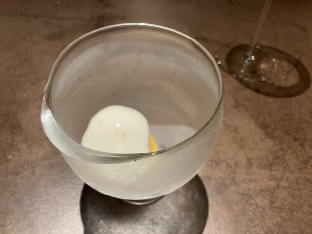 栗のフラン、ホロホロ鳥の白レバームースのラビオリ。上の泡は酒粕エスプーマ。
