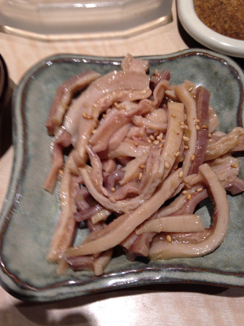 ということで、久しぶりのみつぼでホッピーセットです。焼きものは、自分のデフォルト「ナンコツ」はマストアイテムで、後はハツ。この日は、そんなに焼く気分でもなく、センマイ刺しをいただきました。辛味たれがいい感じです。