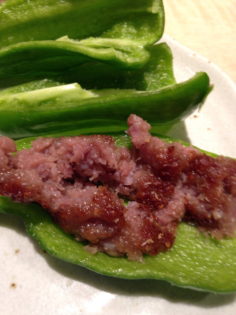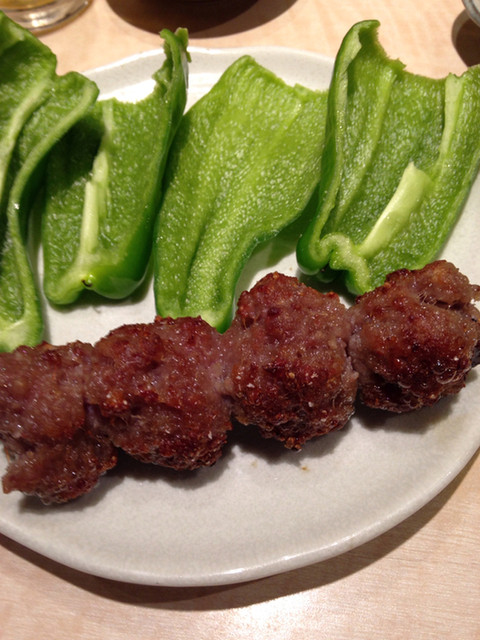 さらに「つくね&生ピーマン」というこのお店最強のメニューをいただきました。肉詰め風にするのがお勧めとのことですので素直に従います。確かにこれはありでしょうね。その後もお好みで串を追加し、一人飲みの割りにはいいお値段でした。