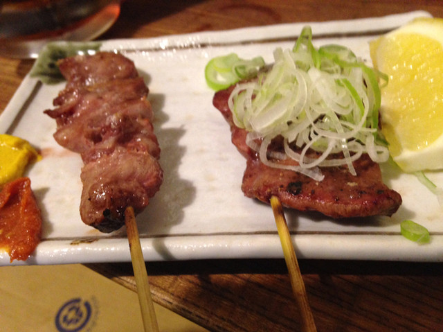 とりあえず、ホッピーセット!もつ焼き5本盛り!をオーダーします。ホール係りは日本の方ではないようなので心配しましたが、杞憂でした。やや時間がかかったかと思いましたが、厨房のオヤジさんから直接5本盛りをいただき、さらにレバとホーデンの串を追加。もちろん、ホッピーセットも今度は黒で追加。