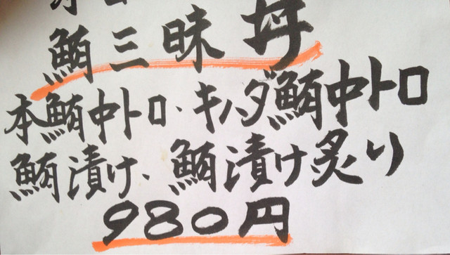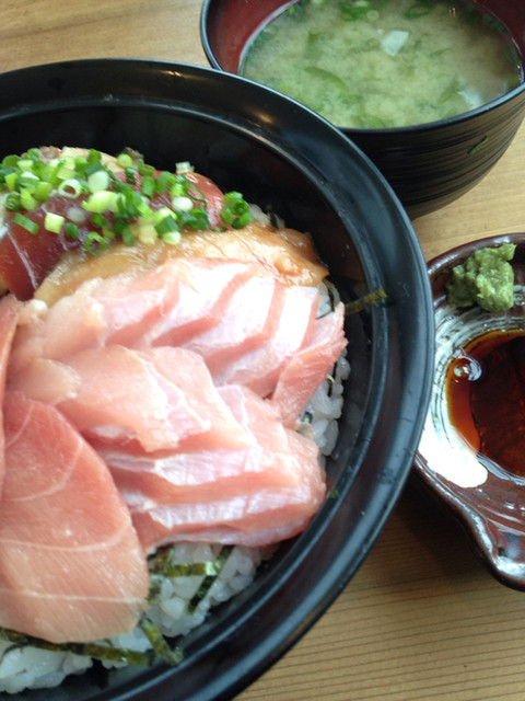 で、お目当ての限定特選本鮪丼はあいにく売り切れでしたので、鮪三昧丼@980円+大盛り(具)@150円をいただきます。本鮪中トロ、キハダ鮪中トロ、漬け、漬け炙りがのっているバージョンです
