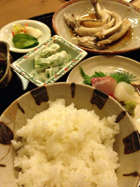 清潔感あるカウンター席に順々に食器が並びます。漬物・ご飯・味噌汁、そして刺身の小鉢と煮付けの平皿。見ただけで素敵です。日本人に生まれてよかったとさえ思います。