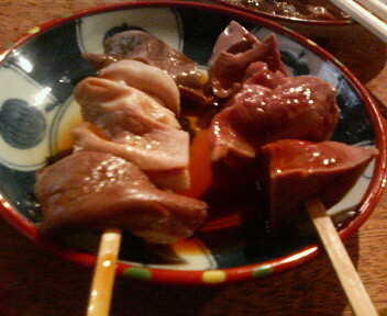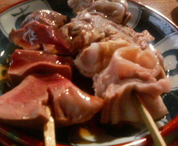 大ビンともつ焼きにレバ、はつ。