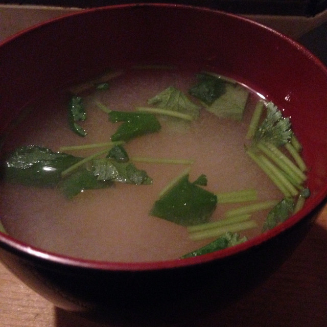 楽しい時間は、早くに過ぎてしまうもので、もう6時半です。片づけの時間もあるでしょうから会計をしてもらいます。その時、マスターは、味噌汁飲むでしょ?みたいなことを言って、〆の味噌汁をサーブしてくれました。この心遣いが人気の秘密なのかもしれません。