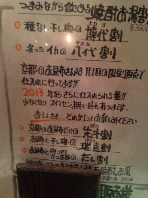 飲み物は焼酎をいただくのですが、京都から取り寄せた自慢の昆布入り焼酎をいただきました。最初の一杯@380円ですが、二杯目以降は注ぎ焼酎のセルフサービス@200円になります。これでかなり飲みすぎました。