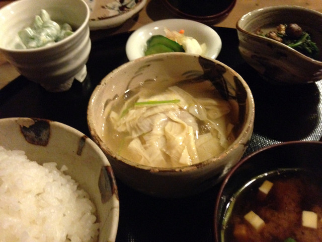 一方の定食も素敵でした。小鉢のスナップエンドウとほうれん草胡麻和えが素朴な味でお酒がほしくなります。あんかけの湯葉もよろしかったですね。期待の越前蕎麦は期待値が高すぎたのでしょうか、蟹と比べると印象が薄くなってしまいました。