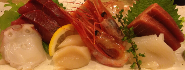刺身7点盛りが何と…@850円!甘海老大・いかそうめん・サーモン・まぐろ・ホタテ・ブリ系・かつお、これが各2切れですから、一切れ@50円ちょい(**) これは奇跡に近いです。