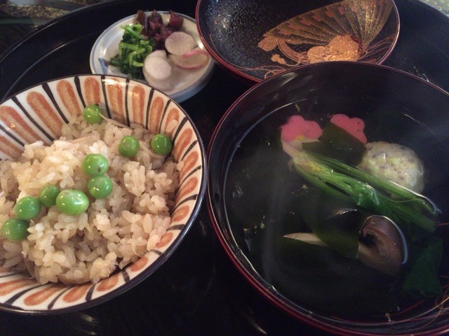 先付けは山菜の入った春らしい感じの逸品。椀は、その大きさに目を剥きますが、白味噌のちょっと変化球的なお味です。