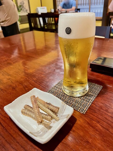 神亀のお燗は欠かさず。お酒を頼むと無料で骨せんを付けてくれるのもさすが小川菊