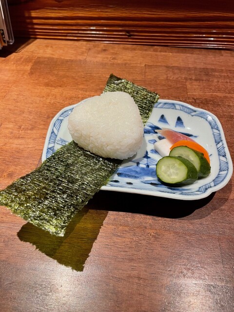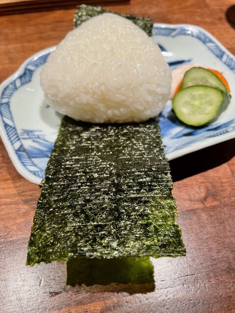 女将さんの実家から送られるお米のおにぎりは女将さん自らお握り。海苔巻ききってないスタイルは好みです