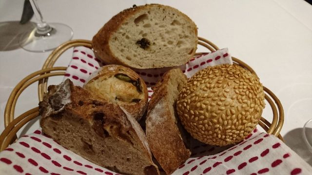 「サン・ル・スー」さんのパンは、バスケットに6~7種類取り揃えたものを持ってきて下さって、各テーブルでおのおの好きなパンを好きなだけサーブしてもらうスタイル。冷めないように、きちんとナプキンでくるまれたパンは、バゲット、くるみやハーブ入り、カレンツ入りなどバラエティ豊か。お代わりも出来ますが、美味しくてつい食べ過ぎてしまうのが玉に瑕。
