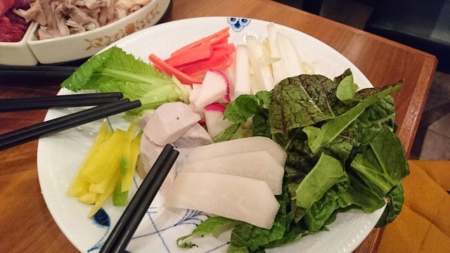 野菜も20種近くと豊富なので、2回に分けてサーブされました。このお店お得意の大分の野菜がずらりで、つぼみ菜、ターサイ、赤カブ、金時人参、芽キャベツなど、火鍋の具材としては珍しい野菜もお目見えです。