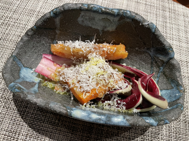 ・ブレスドリ出汁を含んだ海老芋(5Lサイズ)素揚げ、福井のヤマバトのラミエ(モモ肉)、クローブ/フェンネルシード/自伝酒のソース、ふきのとうのガクのソース