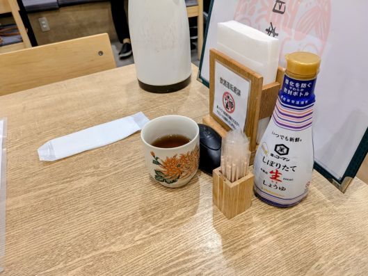 卓上には、醤油/ポット(冷茶)/紙ナフキン/楊枝/メニュー/etc