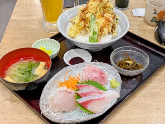 お料理の内容は、天丼/味噌汁/香の物/有料OPのお刺身etc