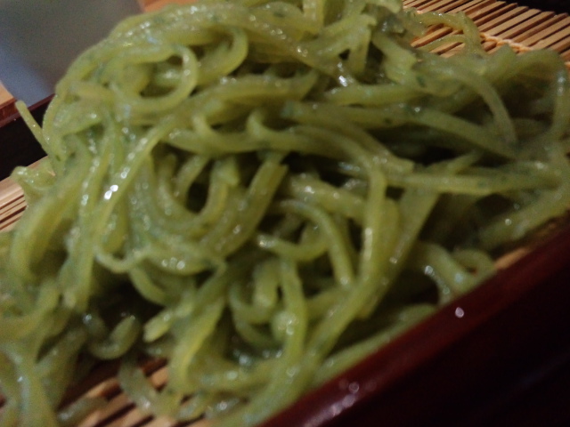 エッジの綺麗な細切りの生粉打ち、次は紫蘇を練り込んだ透明で清涼感のあるチョイ太めの紫蘇切り、そして最後は思ったより細かめの粉を使いチョイ太めの蕎麦切りの粗挽き