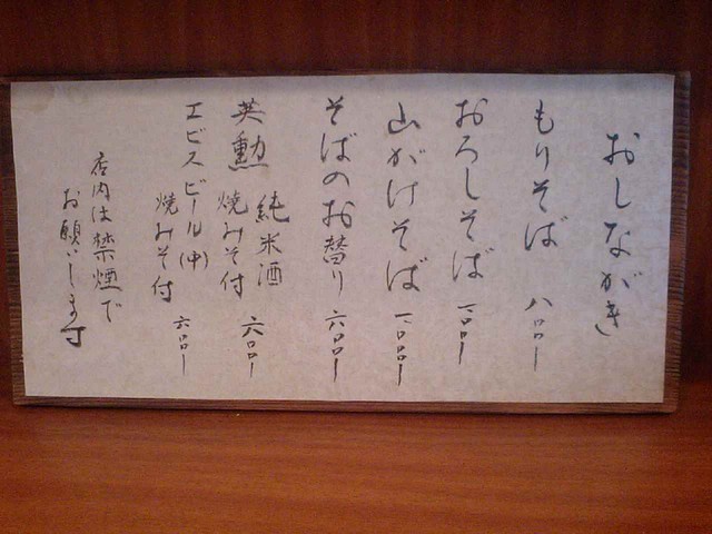 カウンター席に着き、香り弱めの蕎麦茶を啜りながらメニューを拝見し注文を通した