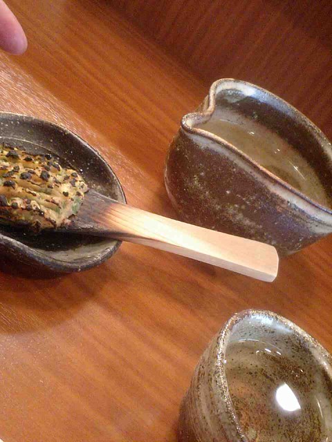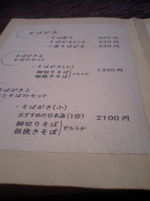 席に着き銅版製のメニューを拝見、お願いしたのは”そばがき(小)”・”おすすめの日本酒(一合)”・”細切りそば・粗挽きそば(どちらか)”がセットになった\2,100-、折角なので両方いただこうとあらかじめ+\840-で蕎麦を追加