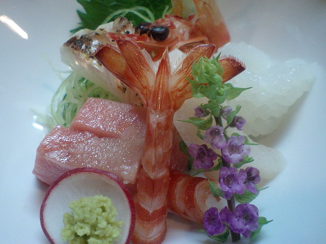 刺身盛り合わせ 大き目の落ち着いた器に綺麗な盛り付け、マグロ・イカ・他2種全てパーフェクトな旨味、そしてなぜか大き目の松茸が添えられていたがこれも焼き加減に狂い無し、飾りに使っていた南瓜のケンには目からウロコ