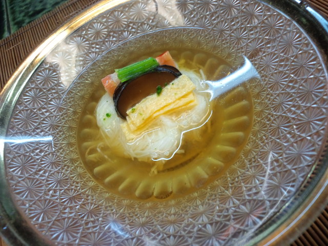 海老やらなんやら乗せてジュレが塗された冷たい玉子豆腐、暑い日には嬉しい一品やね