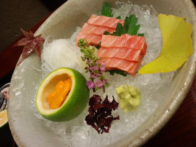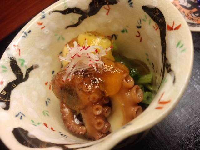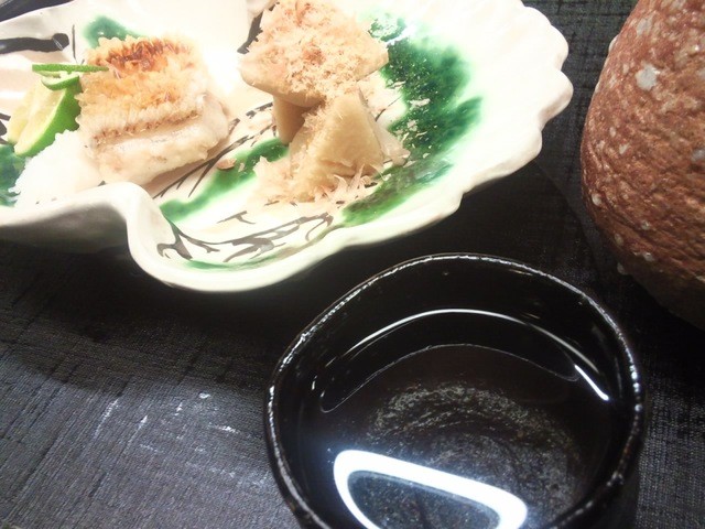 他には目の前で仕上げたタタキや菜っ葉と菊の酢の物、粒焼きの白子や美しい椀もあったなぁ