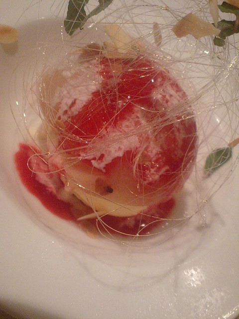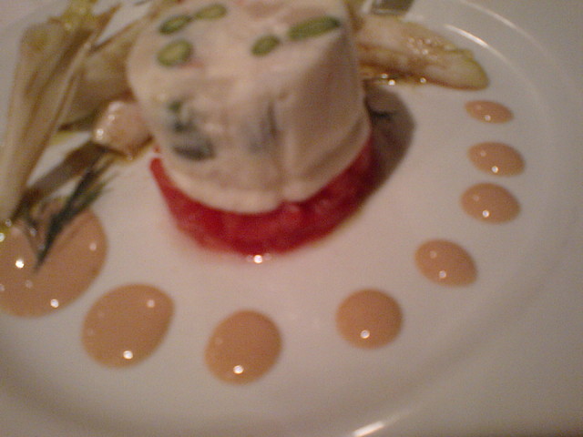 次はとても綺麗に盛られた前菜、しっかりと味付けされており食感も良し、ワインがすすみパンもすすむ、ここで小分けで食べていた最後のパンを手に取ると同時に新しいパンが置かれる、あまりのタイミングの良さにわんこそばを思い出す(笑)