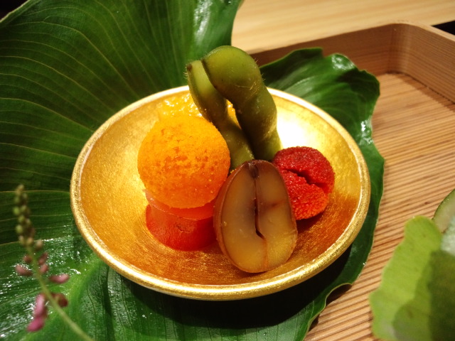 壬生菜胡麻和え・鷹ヶ峰唐辛子煮・フォアグラ入りの透明な煮こごり