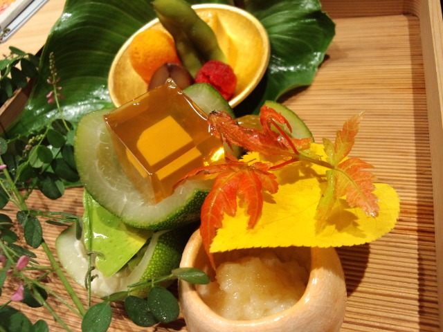柿を敷いて、渡蟹・長芋・菊酢の物、ジュレ掛けで穂紫蘇を飾って