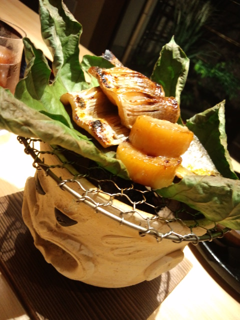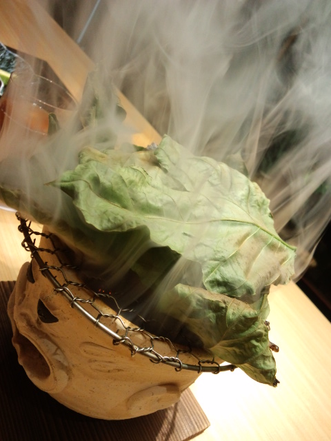 鬼?顔を模した火鉢に吉野葛の葉に包まれて、鮎干し・帆立(醤油・味醂)・かます(西京漬け)