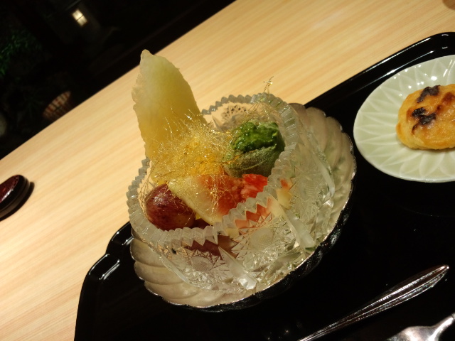 寒天とフルーツにアイス(抹茶?失念)で飾りは飴細工、途中で黒蜜を掛けて