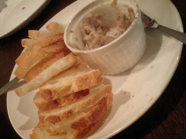 豚のリエット、塩気も油脂もしっかりで器に大盛り、傍らにはドンクさんのバゲットがいっぱい
