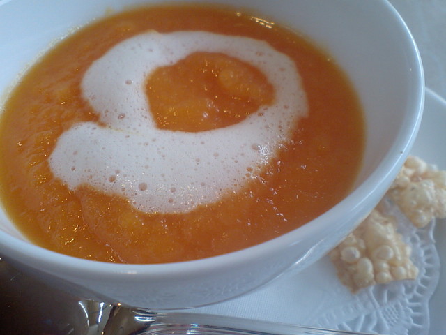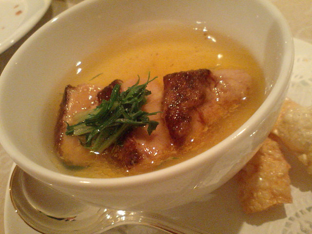 洋風の茶碗蒸しのようなものに人参のピュレで傍らには湯葉の素揚げです、優しいコンソメ味で人参の甘さが上質、食感の楽しい湯葉を崩してクルトン状にしていただいた