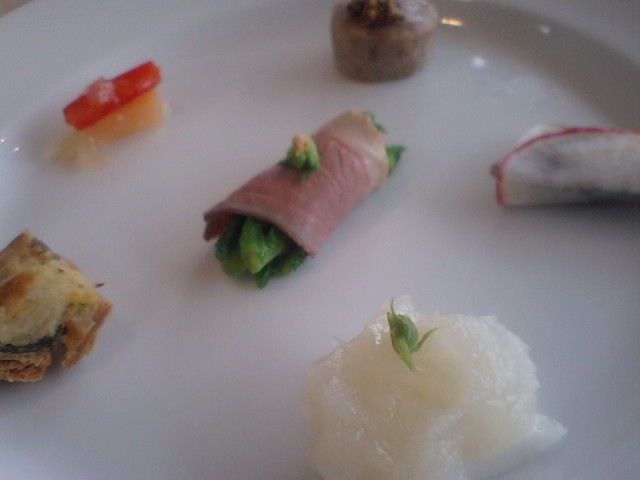 淡い味付けのものからどうぞとの事で時計回りにいただく、蕪のムース(下には長芋)、キッシュ(下仁田葱)、マリネ(ギリシャ風)、ソーセージ(山口祝島の豚)、関鯖のスモーク(柑橘を利かせて)、京鴨ロース(菜の花を巻いて飾りにフキノトウ)