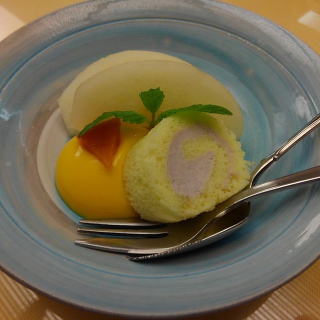 先附け・八寸と続き最後はちっさいロールケーキが添えられた水物