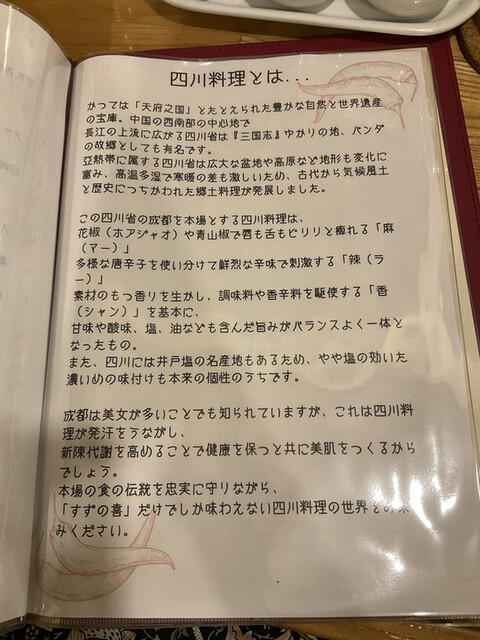 街の普通の中華屋さんっぽい立地、外見だけど、メニューには四川料理が並ぶ。