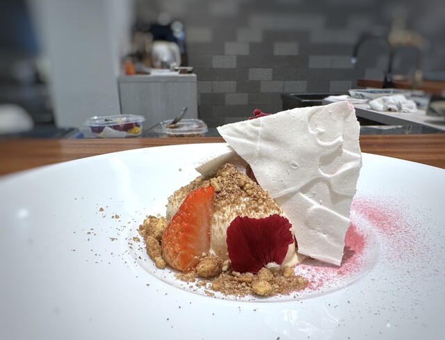 ◆あまおう、ビーツのムース、バニラアイス、メレンゲクッキー 盛り付けの工程を眺めていたのですが、丁寧に盛り付けられ記載した品以外にも 色々使用されていました。凄いな~♪