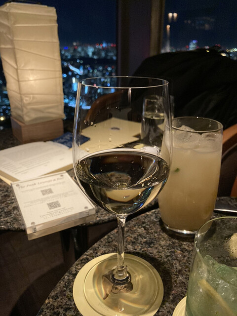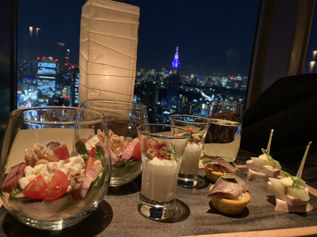 案内されたのは富士山とは逆の新宿側で、これからの時間はこちらのほうが景色が良いので、ラッキーだった。まずはスパークリングワインで乾杯。