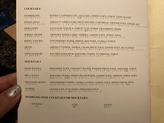 最後にモクテルも頼んでみた。モクテルもすごくおいしくて、わざわざ頼む価値あり。右のメロウドベリーというストロベリーピューレにクリームの乗ったカクテルはまるでデザートのよう。