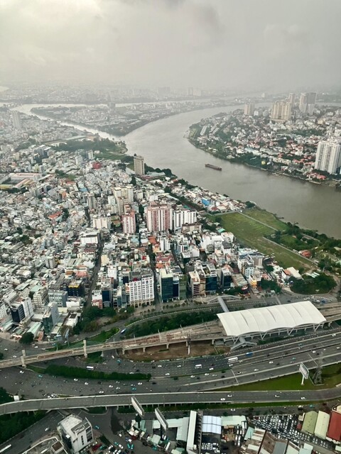 ソフトドリンクは1,200円くらい、カクテルは1,800円くらい++税サ。いい値段だけど、ホテルのバーだし、チャージなし。展望台はドリンク一杯分より高いので、こちらのほうがいいかも。私のカクテルはsoursop ginger coolerという、ラムベースにサワーソップジャムとバタフライピーが入っているカクテル。280kドン。フォームとお花がおしゃれ!ロケーション抜きでもわざわざ飲みに行く価値ありの手のこんだカクテル。