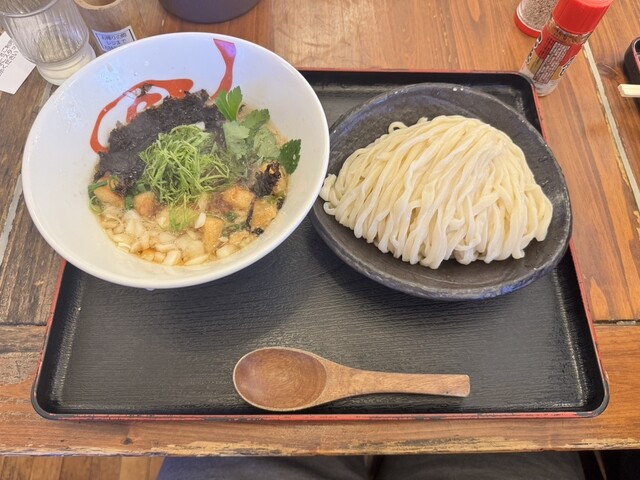 注文は迷わず「岩のり背脂うどん」。今回はつけ麺スタイルで、トッピングに刻み玉ねぎを追加。待つこと10分ほどで着丼。