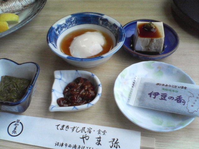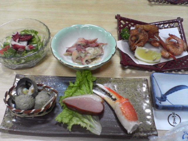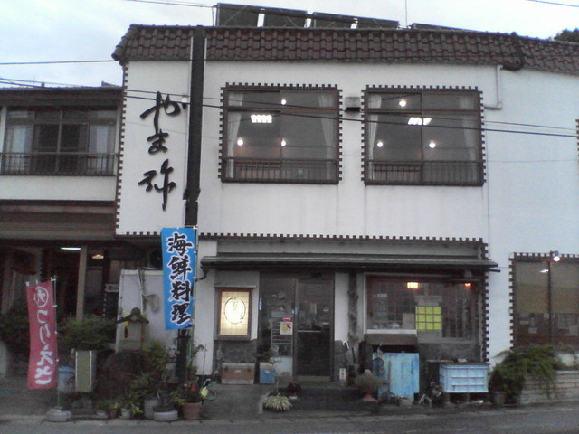 ここは、なんといっても海の幸が新鮮で美味しい!石鯛の生き造りを中心とした刺身の盛り合わせは絶品でした。この刺身はただそのまま食べても良いが、この店の特徴は、この新鮮なネタで手巻き寿司にして食べる!ところです。のりに、ほどよく酢のきいた酢めしをのせ、鯛、タチ、アジ、生桜えび、まぐろ、いくら、うに、たまご、などなど・・・好きなネタをのせて巻いて食べるだけ。これが、楽しく、そして当然美味しい!。料理はその他、タコのサラダや、とこぶし、カサゴのから揚げ、タチの煮つけなど、これらは一人に一ずつと、海の幸のフルコース。ビールも進み、最後のあさりのお吸い物まで大満足でお腹一杯になりました。