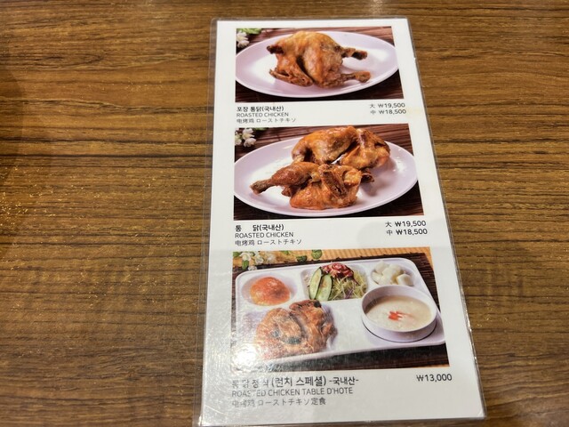 よくなるかもしれない。毎回2階に案内されるが、今回は初の一階席。やっぱりここの参鶏湯は旨い。丸鶏が入ってて、この金額は日本ではありえない。同時に、ローストチキン(中)を頼むのだが、やっぱり少し油分は少なく、パサっと感があるね。個人的にはフライドチキンの方が好きだけど、食べた事無い方は一回試す価値があり。一人だったらプレートもあり、隣の女性はパンチャンを何度もおかわりしていたよ。