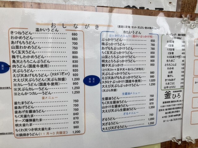 店頭に写真付きのメニューが色々とあって(ビックリ天丼980円、人気No1生醤油うどん750円、あげなすと豚バラのつけ麺980円、明太チーズ釜玉960円等々)どれにしようか迷います。